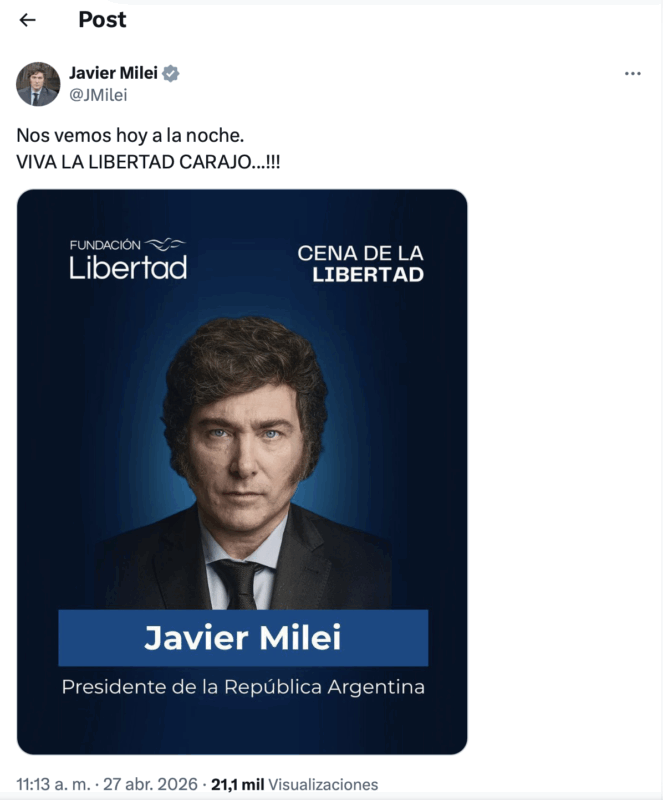 El presidente Javier Milei confirmó este lunes su participación en la cena anual de la Fundación Libertad a través de un mensaje publicado en su cuenta de X: “Nos vemos hoy a la noche… ‘Viva la libertad, carajo’”.