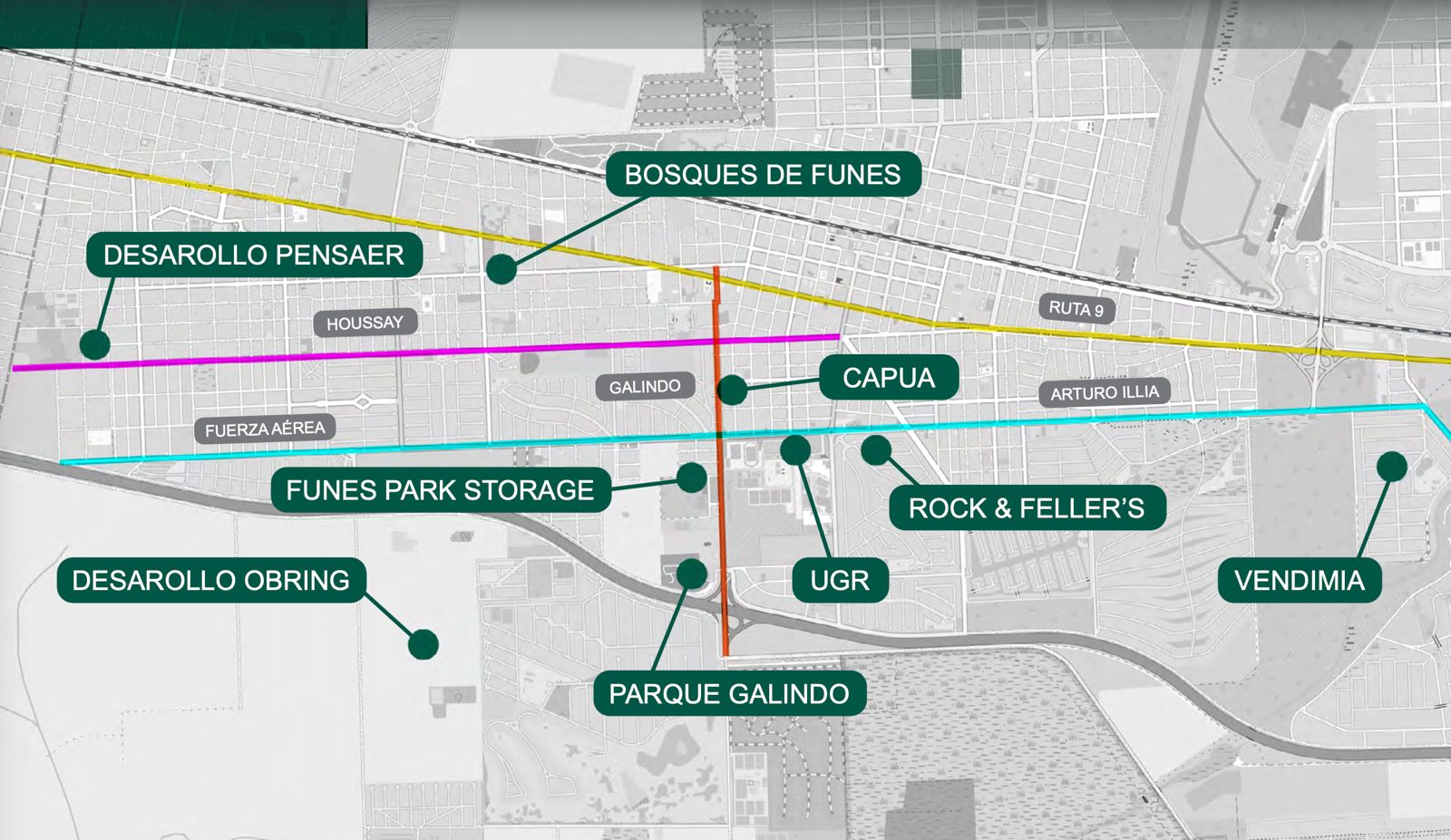 - Funes Valley & Storage, emprendimiento mixto sobre avenida Galindo que integra locales comerciales, gastronomía, oficinas, coworking, gimnasio y espacios de guardado.