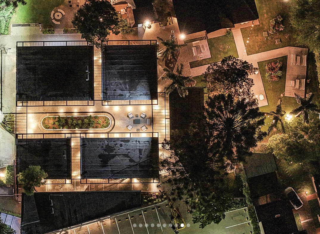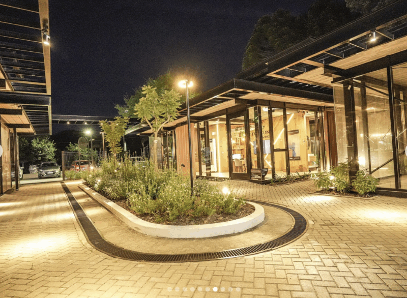 El multiespacio cuenta con más de 5.400 m² de espacios verdes, jardines con especies que florecen todo el año y rincones pensados para disfrutar al aire libre: una experiencia distintiva en pleno corazón de Funes.