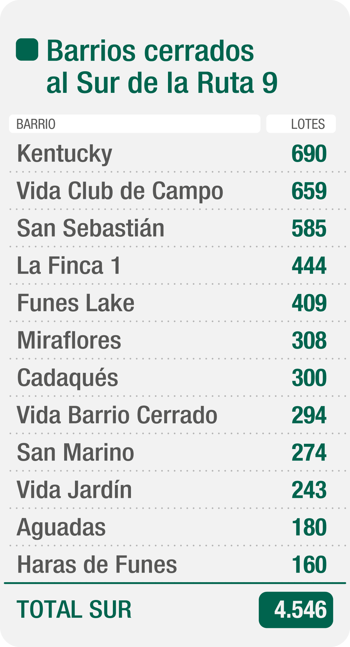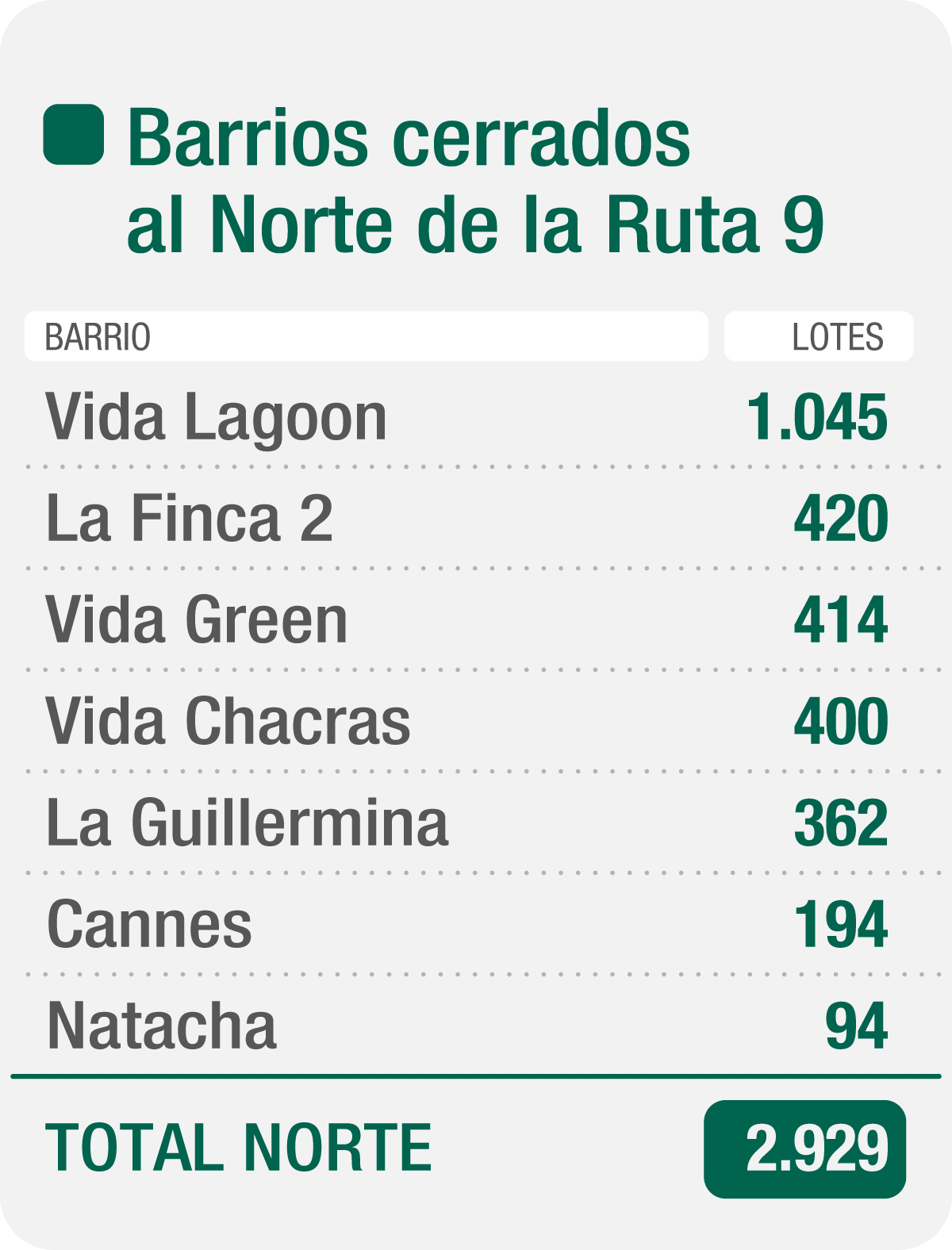 El sur de la Ruta 9 concentra hoy el mayor volumen de lotes y presenta un tejido urbano en gran parte consolidado o en fases avanzadas de ocupación. En contraste, el norte de la Ruta 9 reúne desarrollos más recientes y mayoritariamente no habitados, lo que permite anticipar que allí se manifestará el mayor impacto demográfico y de demanda de infraestructura en el corto y mediano plazo.