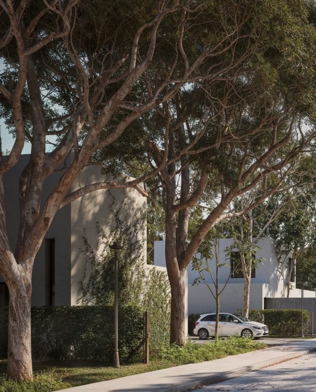 El punto de partida del proyecto fue la lectura del predio existente. La disposición de los árboles, sus copas, las sombras proyectadas y los vacíos naturales definieron la implantación de los lotes —que promedian los 720 m²— y determinaron la ubicación de cada futura casa. El criterio fue claro: preservar la vegetación como activo principal y evitar talas innecesarias.