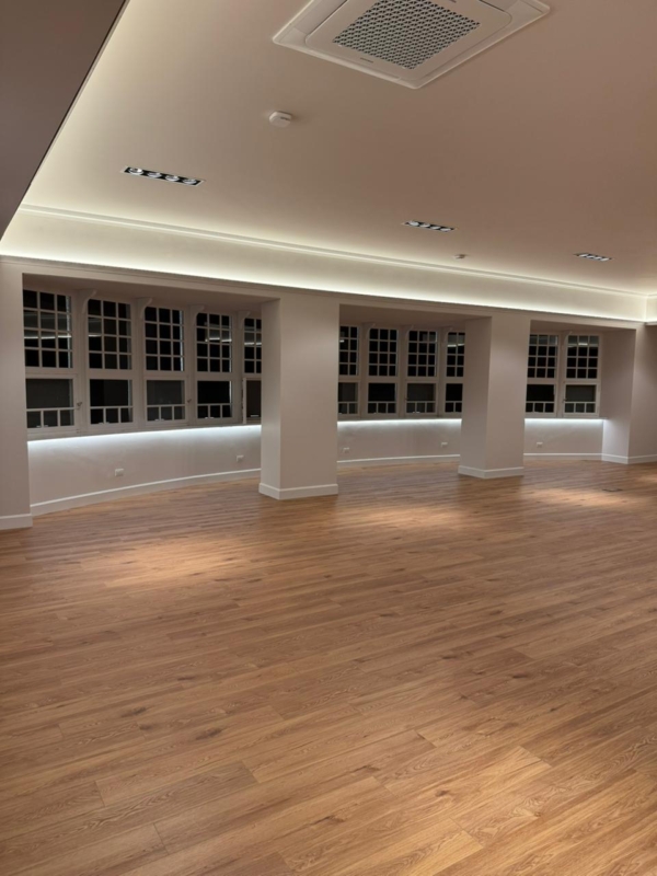 La planta alta, la más afectada por el fuego, fue reconstruida y hoy alberga un gran salón de usos múltiples (SUM) con baños propios, un ascensor que mejora la accesibilidad y un montacargas que conecta directamente con la cocina para el servicio de eventos.