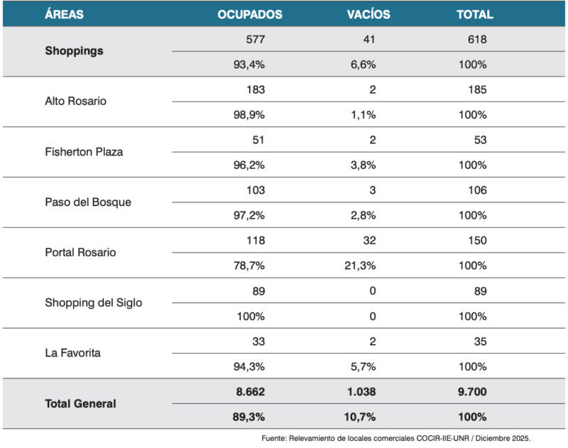 Sobre un total de 9.700 locales comerciales relevados en toda la ciudad, el 89,3% se encuentra ocupado, con una tasa de vacancia general del 10,7%. Sin embargo, ese promedio esconde realidades muy distintas según las áreas. Mientras el Área Central sigue concentrando la mayor cantidad de locales y también la vacancia más elevada (11,3%), los shoppings —y particularmente los del oeste— se destacan por su desempeño.