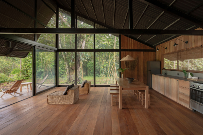 La vivienda cuenta con un área doméstica y enfocada a la vida familiar. Se trata del núcleo central donde se ubican la cocina, el comedor diario y sus expansiones, la galería y el jardín. “Se buscó crear un ambiente acogedor y funcional, donde la familia pudiera reunirse para las actividades diarias. Esta área estaría abierta y conectada visualmente con el resto de la casa, fomentando la interacción y comunicación de la familia”, indica el artículo.