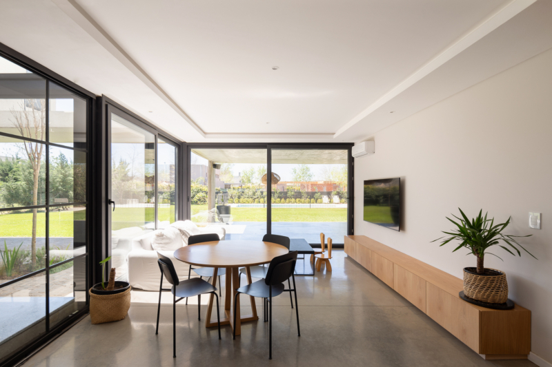 Además, la casa cuenta con un área de funcionamiento independiente concebida como un espacio más aislado y tranquilo, destinado tanto al uso diario como para recibir visitas. Allí se ubican la sala de estar y una sala de juegos o estudio. “Se buscó proporcionar un lugar apartado del área familiar principal, donde los miembros de la familia pudieran relajarse, trabajar o tener invitados”, explicaron.