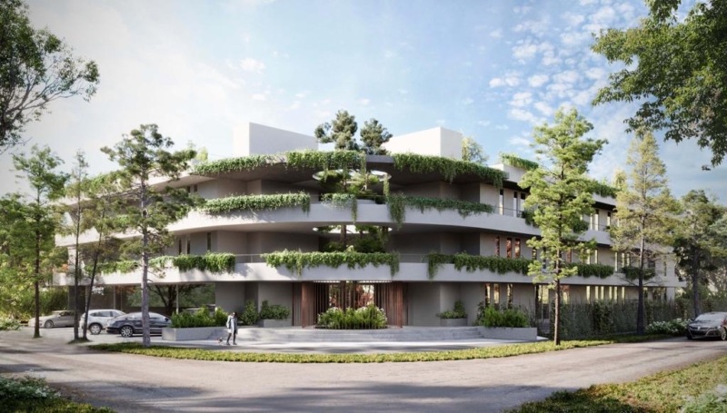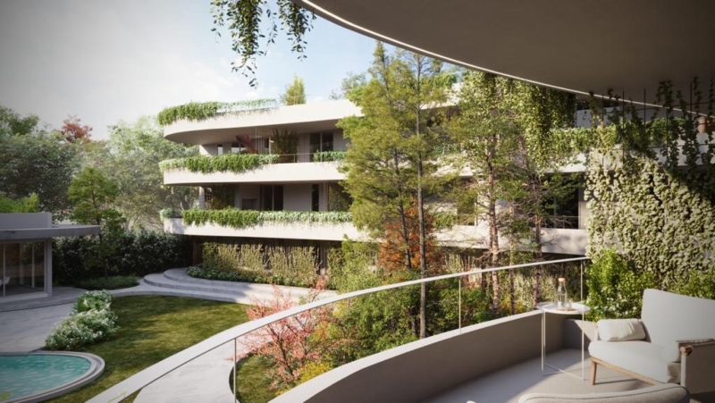 El proyecto mixto para residencias y comercios. El diseño prevé amplios balcones aterrazados con canteros verdes y un parque interno con piscina y salón de usos múltiples.