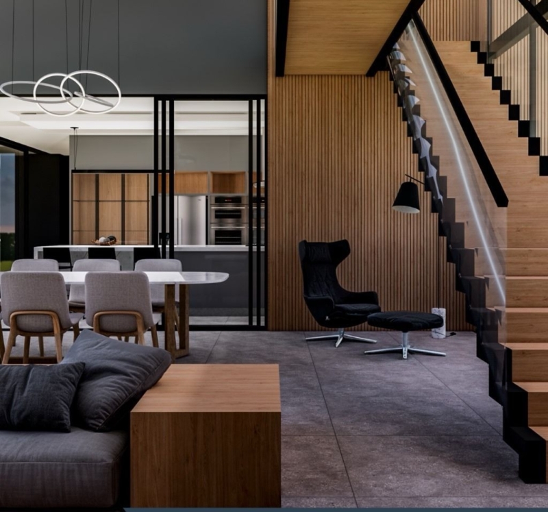 Se trata de una vivienda de 525 m² de líneas modernas, que combina estructura, funcionalidad y paisaje. Su diseño en dos plantas aprovecha al máximo la apertura hacia el lago, integrando interior y exterior a través de grandes superficies vidriadas. En planta baja, las áreas sociales se organizan en torno al parque y la piscina, mientras que el nivel superior alberga los espacios íntimos, con vistas abiertas y terrazas verdes. El uso de materiales nobles —madera, vidrio y hormigón— refuerza una estética contemporánea, cálida y sobria.