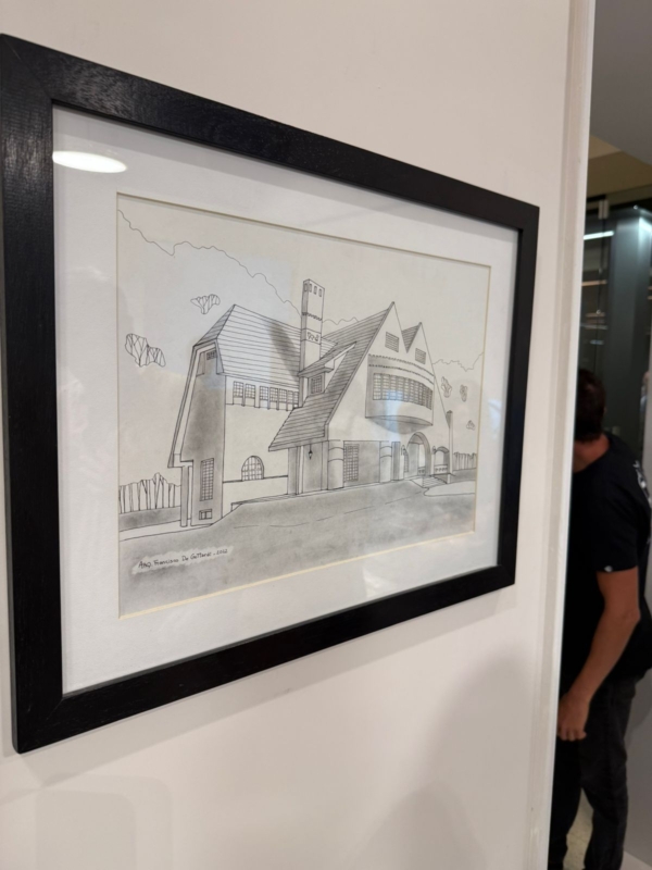Junto a la camiseta se exhibe un dibujo del arquitecto funense Francisco De Gottardi, perteneciente a una familia histórica de la ciudad. Tras el incendio del Club House en 2022, De Gottardi ilustró la casona original como gesto de memoria y homenaje. Hoy, esa obra acompaña al cuadro de Messi, uniendo dos momentos que marcaron profundamente la historia del barrio.