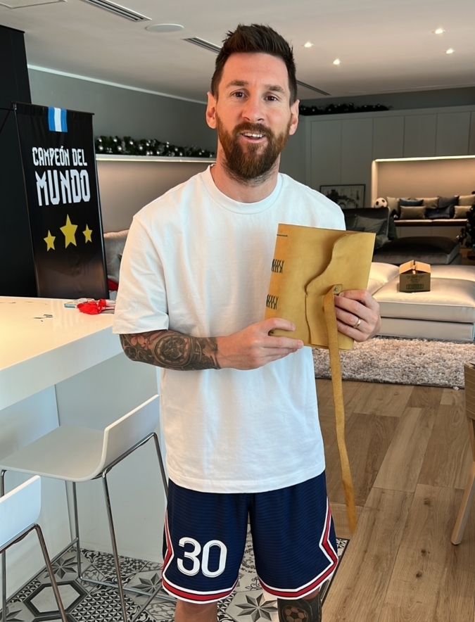 El cuadro central exhibe una camiseta autografiada por Messi, dedicada especialmente a Kentucky, acompañada por las fotografías que documentan su arribo en helicóptero el 27 de diciembre de 2022. Ese día, un sector de la cancha de golf operó como pista de aterrizaje para recibir al capitán argentino y a Ángel Di María, en una escena excepcional, organizada con absoluta precisión.