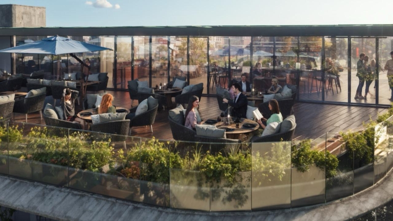 En planta baja, el complejo alberga cuatro locales comerciales: dos destinados a propuestas gastronómicas, con superficies de 370 y 270 metros cuadrados, y otros dos de 60 metros cuadrados, que completan la oferta comercial. El exterior se complementa con un jardín frontal que funcionará como terraza al aire libre y un sistema de garitas de seguridad exclusivas.