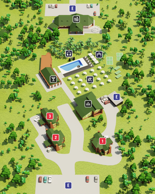 El resort cuenta con 12 cabañas divididas en tres módulos intercomunicados, con tres unidades cada uno. Tiene una capacidad total de 52 huéspedes. Además, ofrece algunas amenities, como un bar recepción, club house, vestuarios, sauna, una piscina, estacionamiento y un salón de fiestas totalmente techado y equipado.