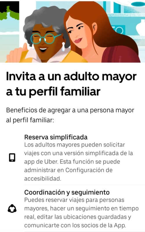 Uber presentó una nueva función orientada a mejorar la movilidad y seguridad de los adultos mayores. Ahora, los usuarios pueden sumar a un adulto mayor a su perfil familiar, brindándole acceso a una versión simplificada de la aplicación para solicitar viajes, especialmente diseñada para facilitar su uso.